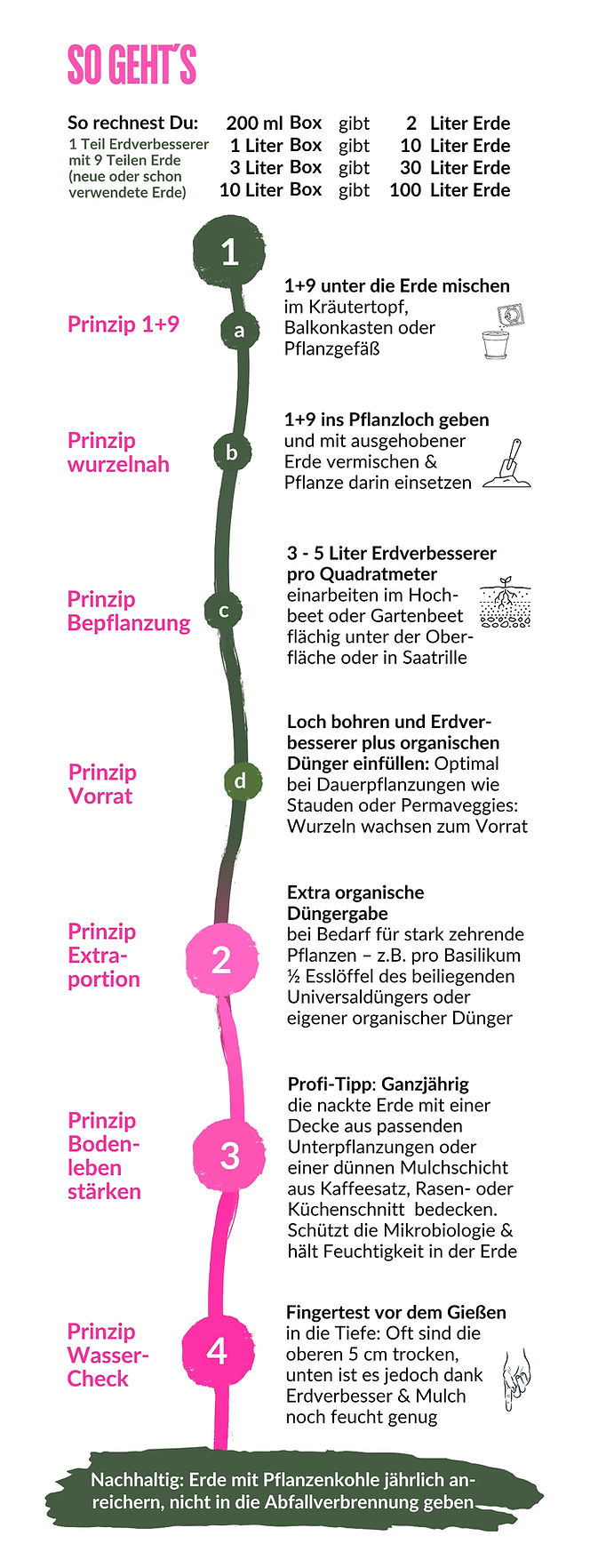 ohne weitere Kompostierung gebrauchsfertig: einfach 10 % Erdverbesserer aus veredelter Pflanzenkohle direkt in die Erde mischen!